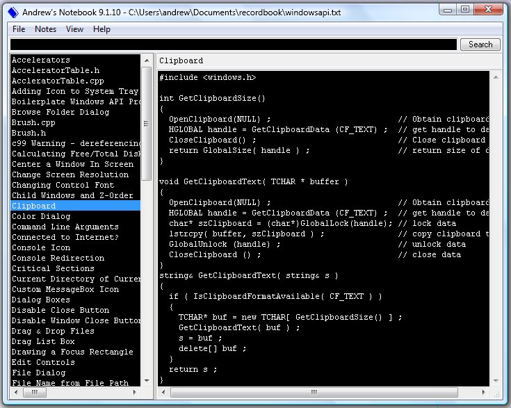 This program is actually a rewrite of an older note-taking tool I created and it uses the same file format. If you're looking for that older version, you can find it here. However this newer version has more features like Unicode (UTF-8) support and searching capabilities.